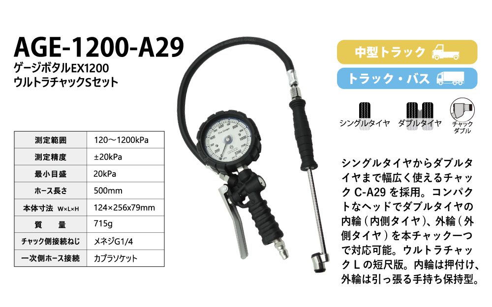 ・シングルタイヤからダブルタイヤまで幅広く使えるチャックC-A29を採用。・コンパクトなヘッドでダブルタイヤの内輪(内側タイヤ)、外輪(外側タイヤ)を本チャック一つで対応可能。・ウルトラチャックLの短尺版。内輪は押付け、外輪は引っ張る手持ち保持型。