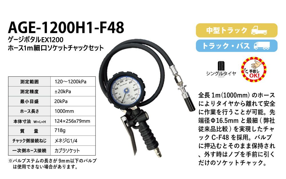 ・全長1m(1000mm)のホースによりタイヤから離れて安全に作業を行うことが可能。・先端径Φ16.5mmと最細(弊社従来品比較)を実現したチャックC-F48を採用。・バルブに押込むとそのまま保持され、外す時はノブを手前に引くだけ。・大型車、トラック、バス向け。※バルブステムの長さが9mm以下のバルブはご使用できない場合があります。