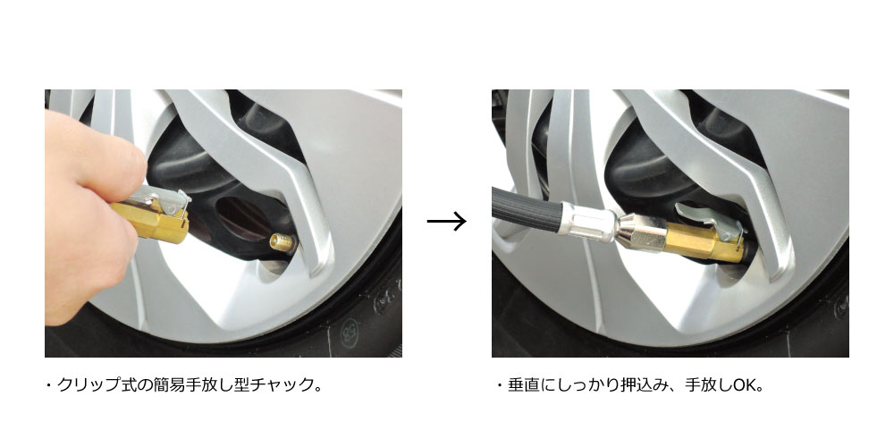 クリップ付きの簡易手放し型チャック。片持ちタイプではあるが、垂直にしっかり押込めば手放しOK。最後にひとひねりねじ込むのもコツ。乗用車向け。オープンタイプ。全長50mm。