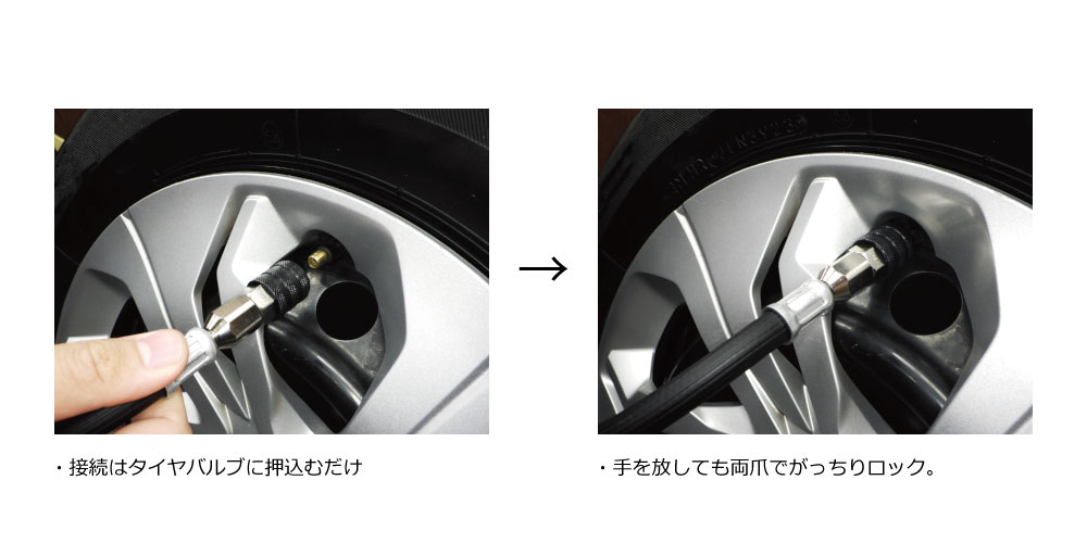 2枚爪ががっちりとタイヤバルブを保持する手放しソケットチャック。カプラー感覚で押込むだけで装着。外すのも簡単。オープンタイプ。全長42mmと手のひらに入るサイズ。乗用車向け。