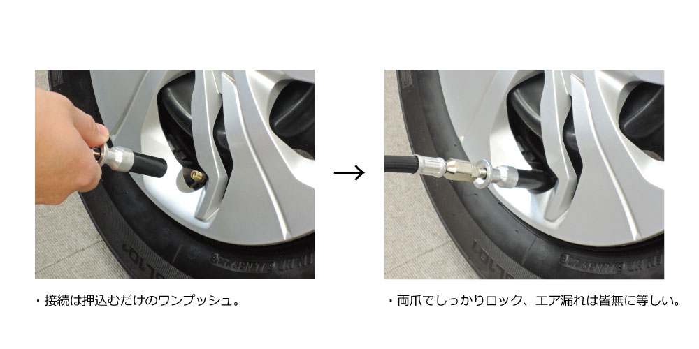 押込むと両爪でがっちりロックする手放しソケットタイプ。先端口径がΦ16.5mmと最細(社内製品比較)を実現。従来比20%減。流量は約10%増。外す時はノブを引くだけの簡単着脱。乗用車、大型車、トラック、バスのバルブ周りが狭いホイールにも適合。