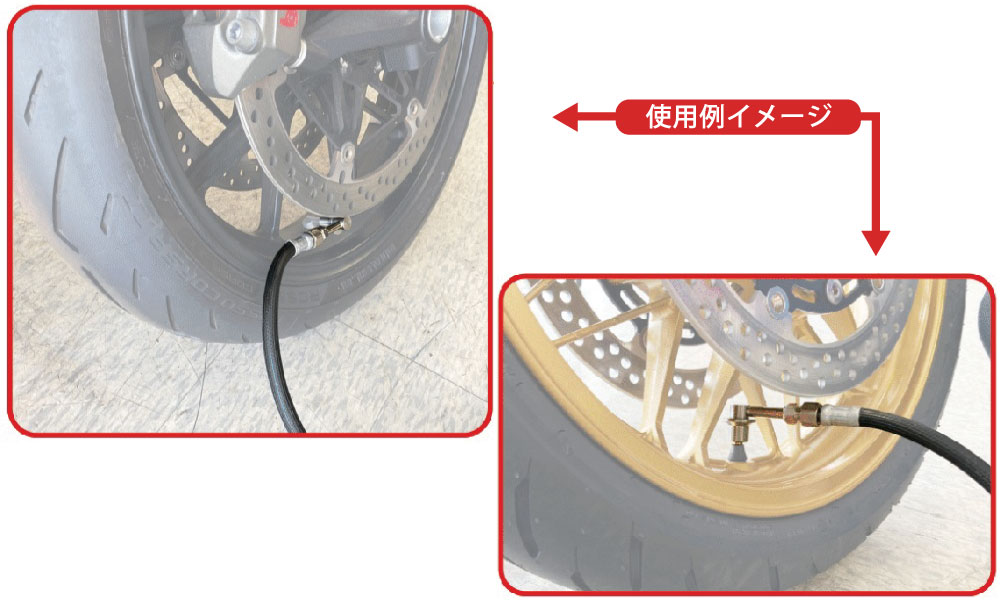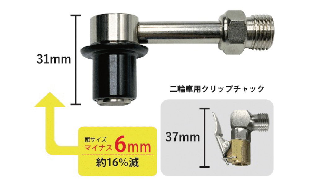 C-A27(二輪用クリップチャック)と比べてヘッド部が小さくなりスペースの狭いダブルディスクのバイクでも使いやすい。バルブに押込むと保持されるソケットチャックの二輪版。適合機種:AGE-600シリーズ適用タイヤ:シングルタイヤ